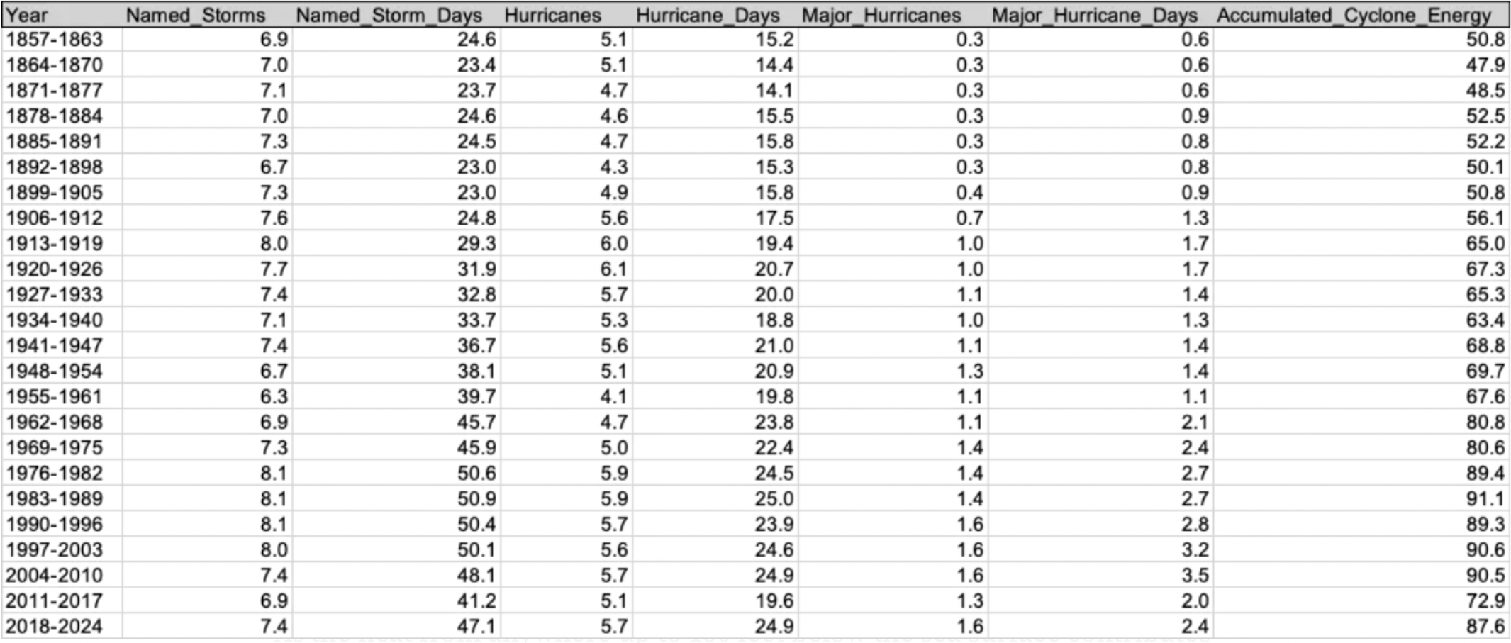 While there was no significant change in the 7-year average for hurricane frequency between 1857 and 2024, in that same time, the number of hurricanes that qualified as major events more than quadrupled (p > .05), and the amount of time per year spent experiencing a named storm increased from 24.6 days to 47.1 days (p > .05). Also, accumulated cyclone energy nearly doubled (p > .05), supporting earlier reports of the strong correlation between rising sea temperatures and increased cyclone power.